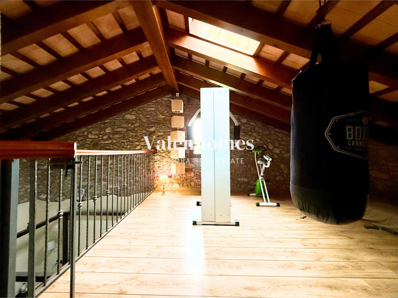 La planta superior alberga una gran suite principal, que incluye un vestidor a medida y un baño completo con ducha, todo ello diseñado con materiales de calidad y un gusto exquisito por el detalle. Además, en esta planta se encuentra un altillo, actualmente utilizado como gimnasio, aunque fácilmente adaptable como una habitación adicional o zona de estudio. Este espacio cuenta con la posibilidad de acceso independiente a través del hueco ya preparado para la instalación de un ascensor, el cual podría conectar todas las plantas, incluido el altillo.