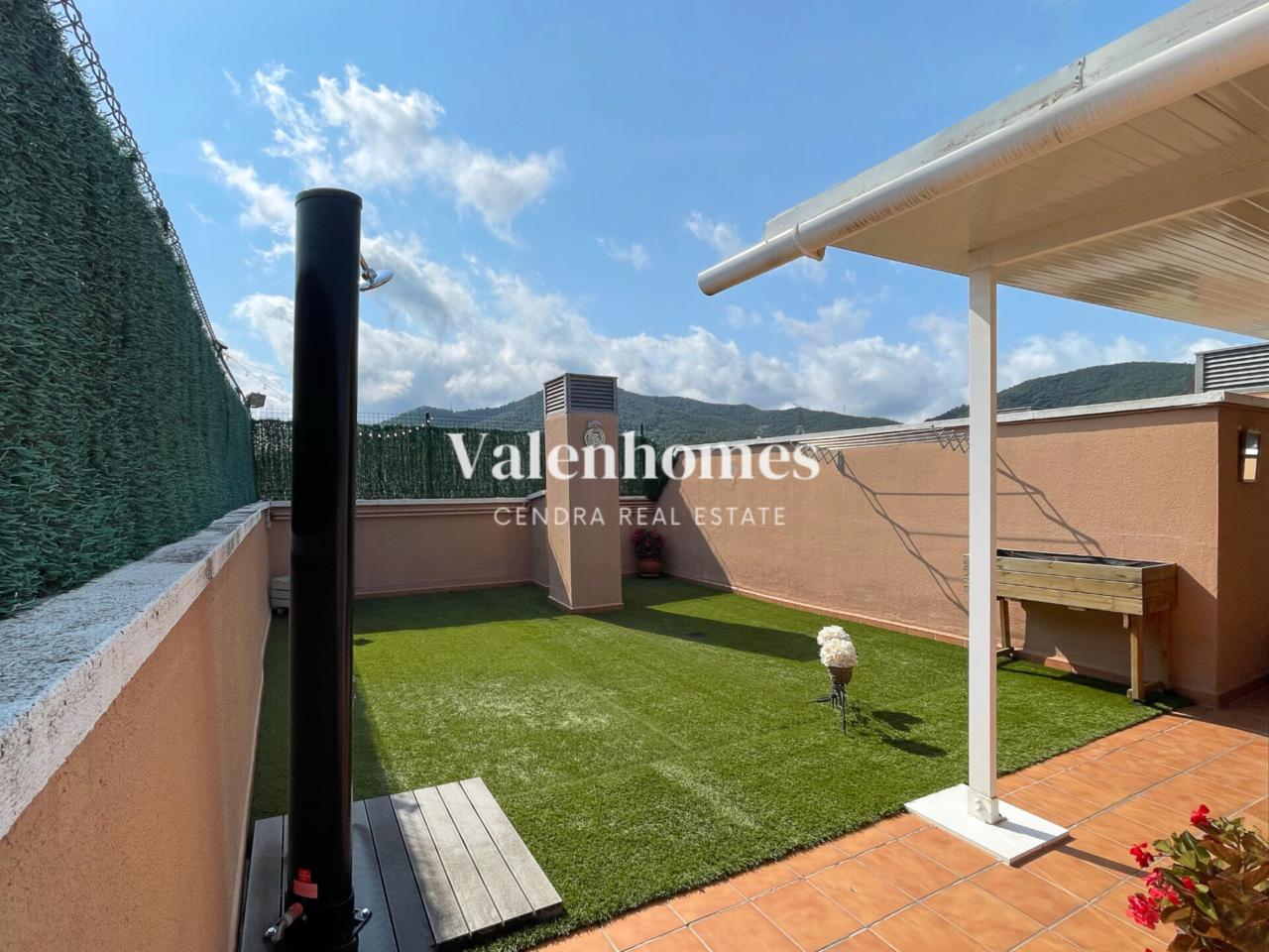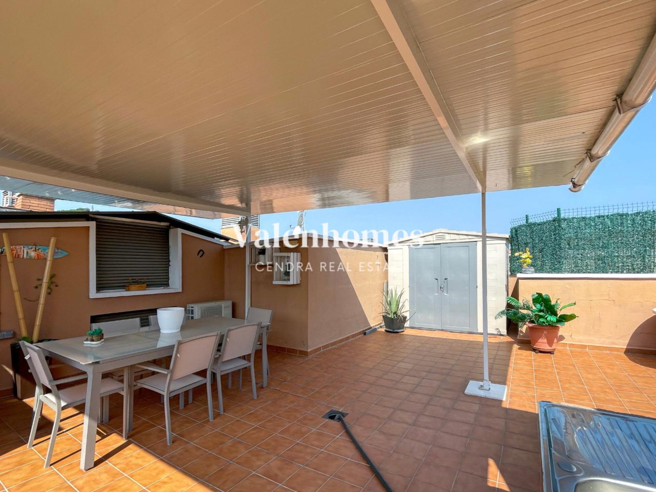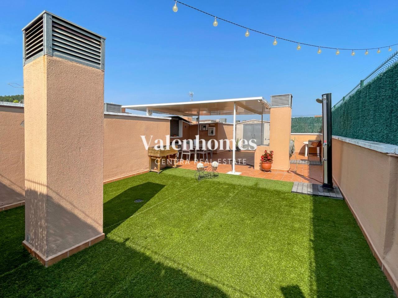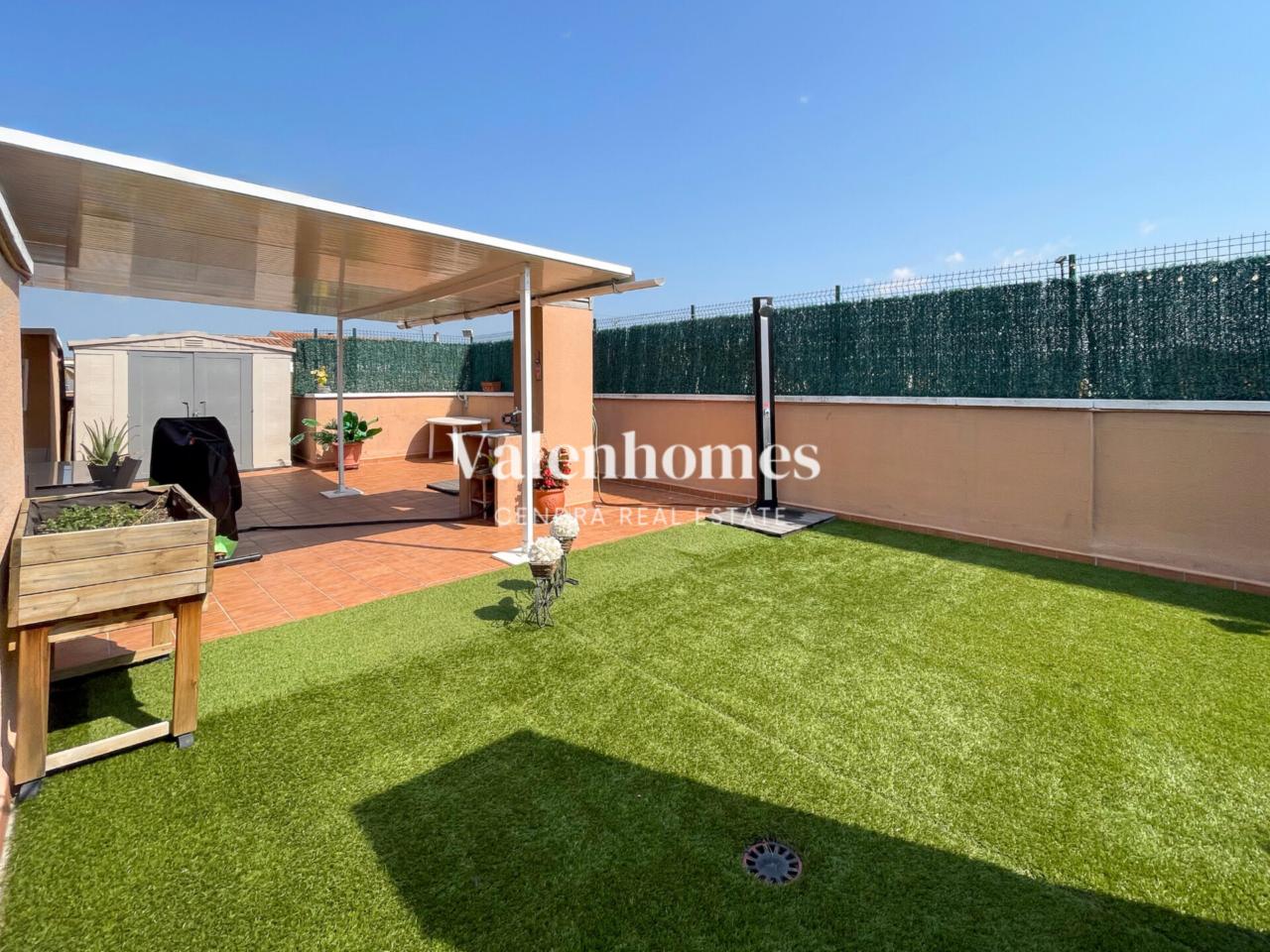 El gran atractivo de esta propiedad es su impresionante terraza privada de 90m², a la que se accede por unas escaleras independientes exterior de la vivienda. Este espectacular espacio al aire libre está ambientado en dos zonas diferenciadas: una con césped y ducha exterior, perfecta para disfrutar del sol y otra zona más funcional con pérgola fija y una caseta equipada con corriente eléctrica, ideal para instalar una nevera y guardar utensilios (reformada pensando en el más mínimo detalle) lo que la convierte en el lugar perfecto para disfrutar de comidas al aire libre o reuniones con amigos.