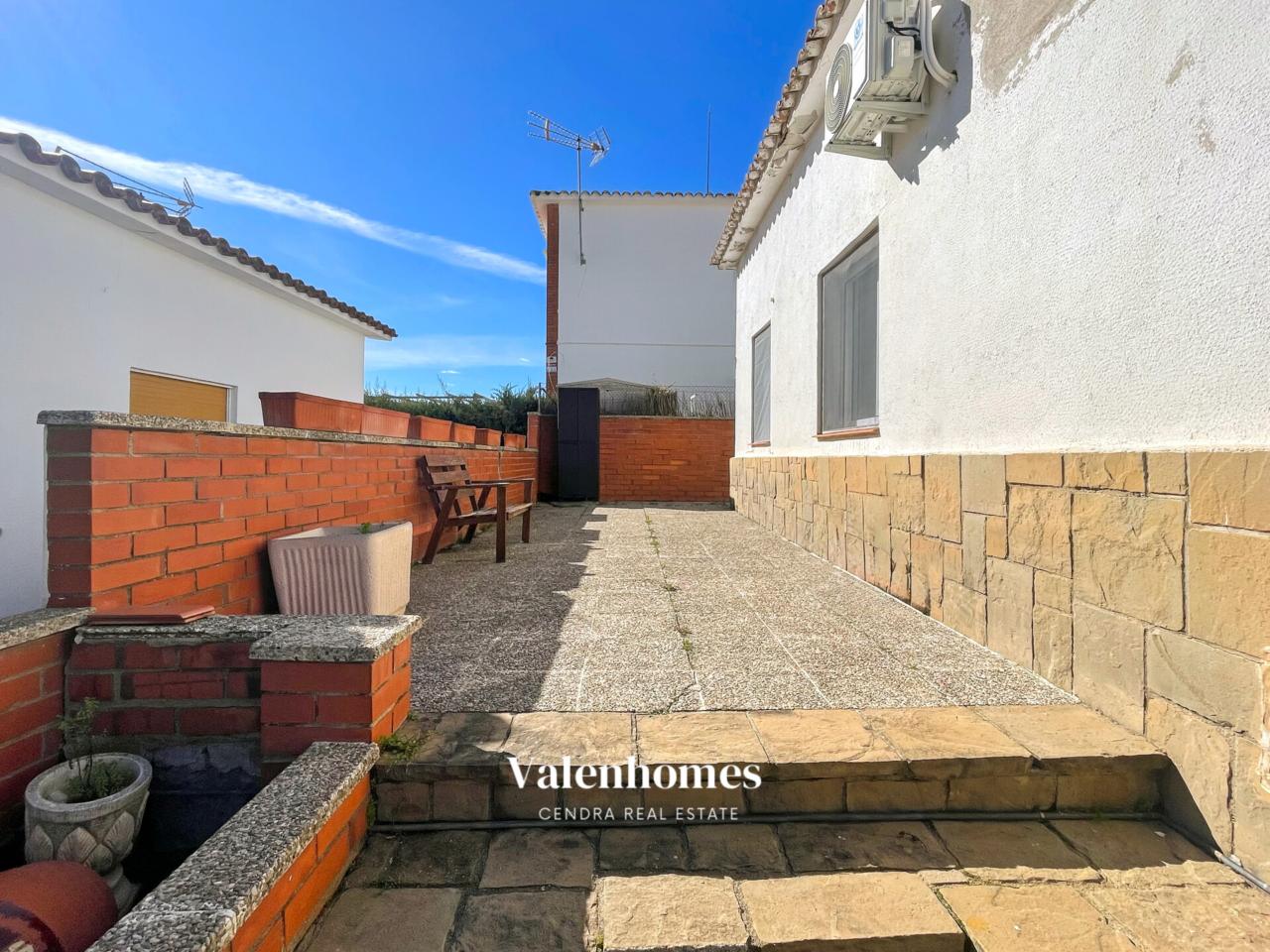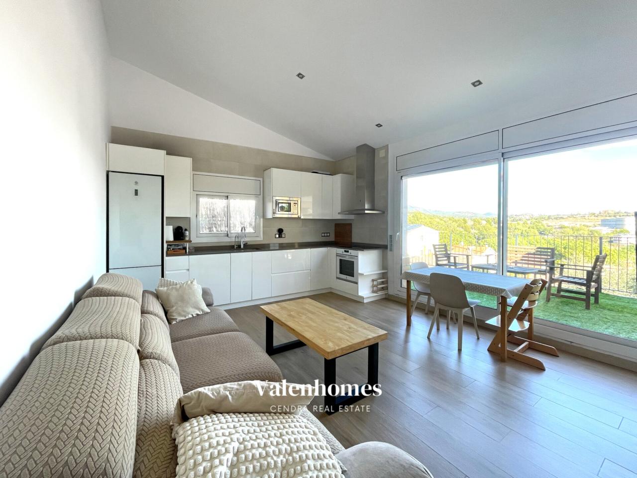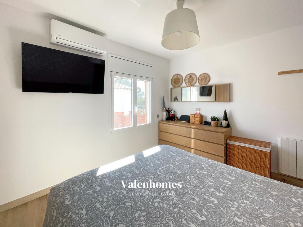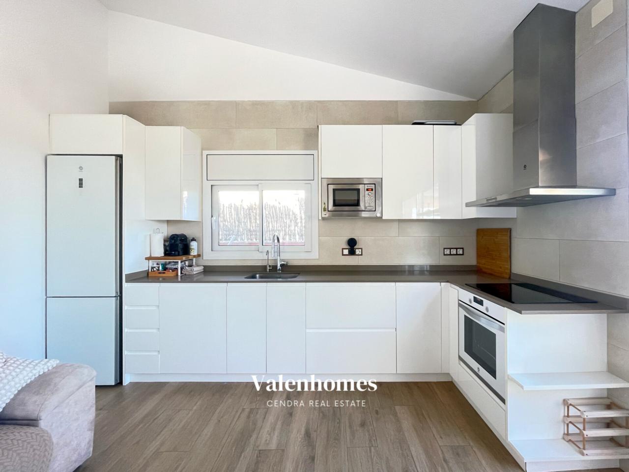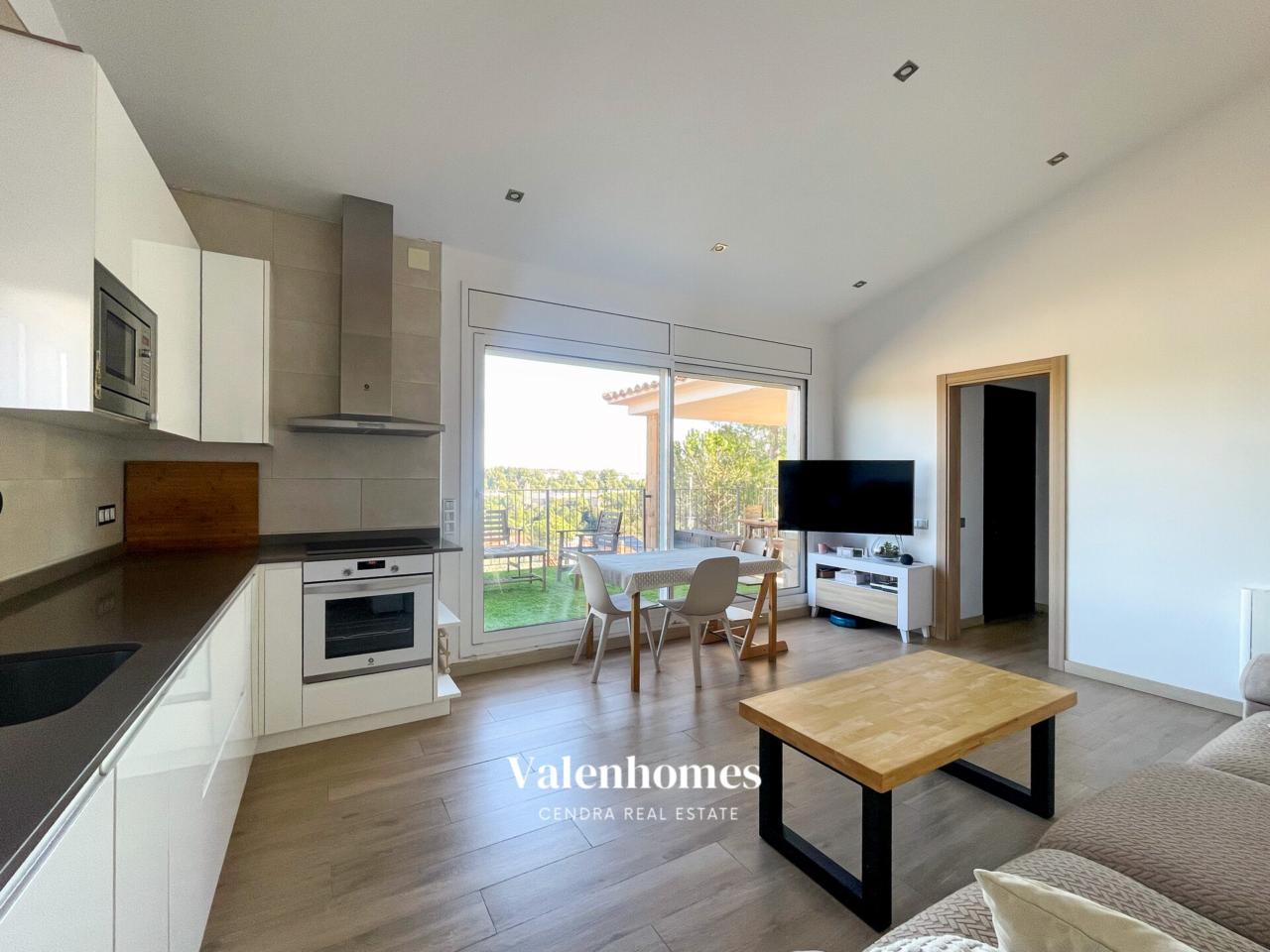 En el interior encontramos un amplio y luminoso salón-comedor con orientación sur y cocina integrada totalmente equipada, creando un espacio moderno y funcional. Desde aquí se accede directamente al porche de la entrada, ideal para disfrutar de las vistas despejadas a La Mola y de momentos al aire libre. La zona de noche cuenta con tres habitaciones dobles y un baño completo con plato de ducha.
